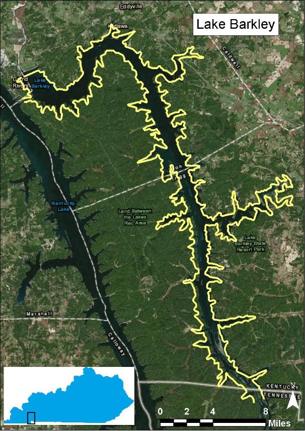 Lake Barkley is a mainstem impoundment created in 1966 and is the last and largest reservoir in the Cumberland River system. It is managed by the U.S. Army Corps of Engineers (USACE) for flood control, navigation, power generation, and recreation. The fisheries are managed jointly by the Kentucky Department of Fish and Wildlife Resources (KDFWR; 45,600 acres) and the Tennessee Wildlife Resources Agency (TWRA; 12,000 acres). The Land Between the Lakes National Recreation Area makes up the majority of the western shoreline and provides a relatively undeveloped shoreline. A few miles upstream from Barkley Dam, a canal joins it to Kentucky Lake. During a typical year, the USACE begins gradually raising water levels to a summer pool elevation of 359 ft above sea level on April 1. Lake elevation is held at summer pool until July 5th when the elevation is gradually lowered to a winter pool elevation of 354 ft above sea level.